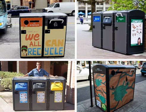 還有各種涂裝各種顏色,鋪主腦洞一開(kāi),要是在這垃圾桶上裝個(gè)顯示屏,是不是就變成了可視窗口?人流量那么大,賣(mài)廣告的話(huà)肯定也是無(wú)比的掙錢(qián)。